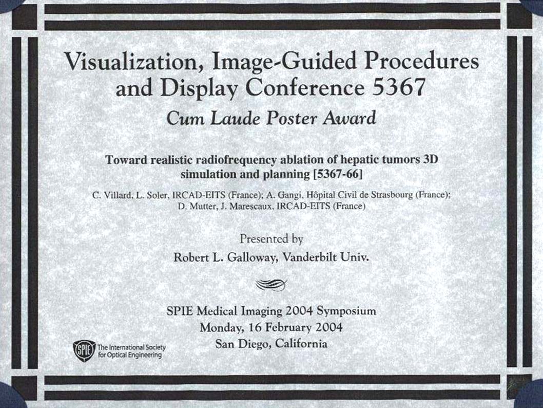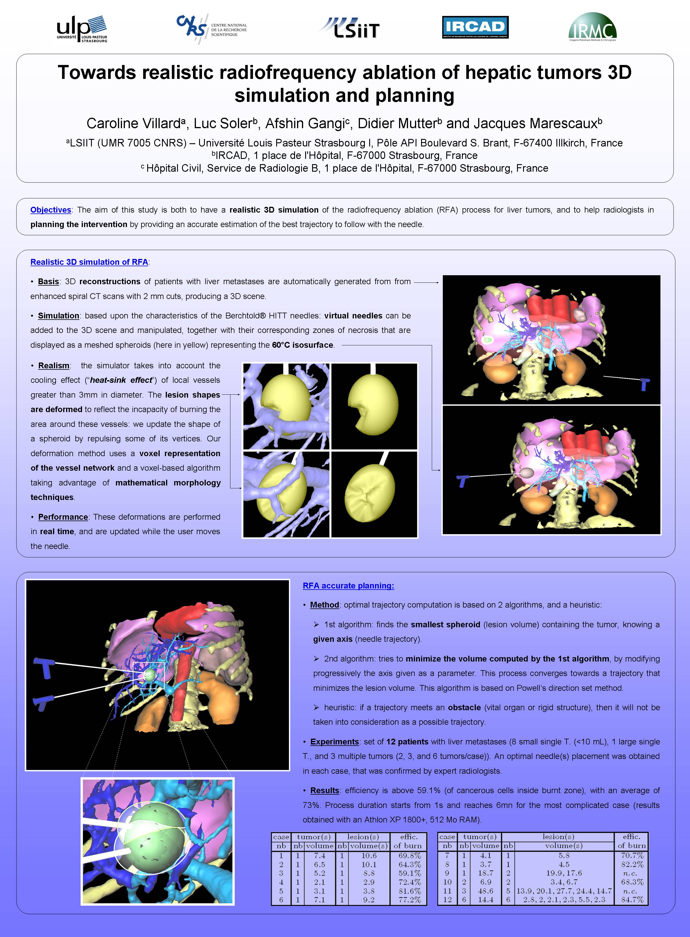 - C. Villard, L. Soler, A. Gangi, D. Mutter, J. Marescaux. Towards realistic radiofrequency ablation of hepatic tumors 3D simulation and planning. In SPIE Medical Imaging 2004: Visualization, Image-Guided Procedures, and Display, edited by R. L. Galloway Jr, proceedings of SPIE vol. 5367, p.586-595. San Diego, USA, CA, Feb. 2004, doi:10.1117/12.534871.